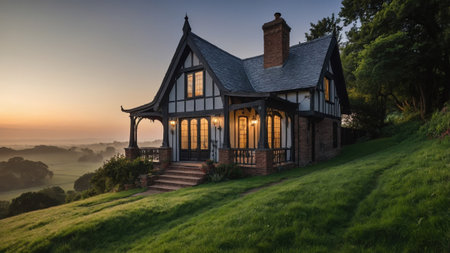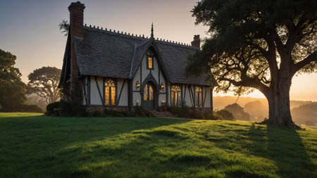 A Gothic Revival cottage stands majestically as the sun sets, casting warm light on its ribbed vaults and intricate features. The surrounding landscape is verdant and peaceful, enhancing its charm.