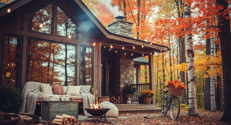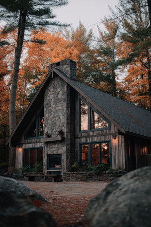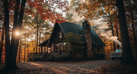 A wooden cabin is surrounded by trees with colorful foliage during the autumn season. The composition features a symmetrical design with warm tones, possibly illuminated by artificial lighting, creating a cozy atmosphere. The image may be suitable for illustrating concepts related to real estate, travel, or seasonal themes.