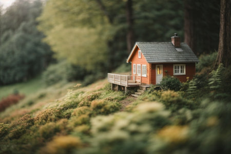 Miniature model of a house in the forest. Vintage tone.