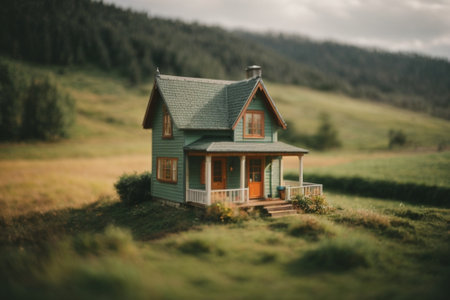 Miniature model of a house in a garden with trees in the background