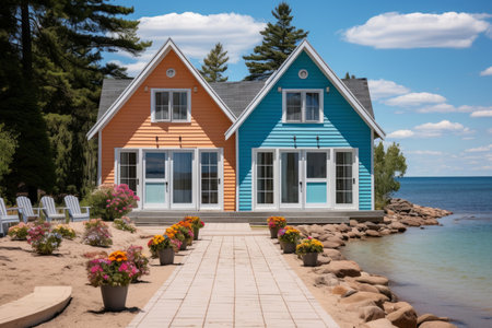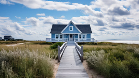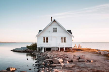 A lonely cottage on a ridge of land on the coast. Ai generated.