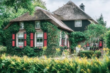 GIETHOORN, NETHERLANDS - August 17, 2017: A thatched cottage whose wall is overgrown by a creeper
