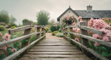 AI Generated. Charming Cottage Scene Wooden Bridge Pink Flowers Garden Landscape