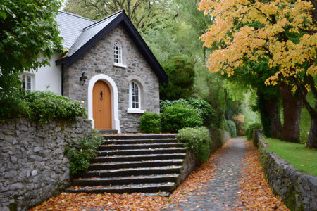 Stone cottage with arched door and stairs, surrounded by autumn leaves on a country path