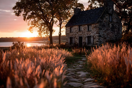 A serene scene featuring a charming stone cottage nestled by a peaceful lakeside at sunset. surrounded by tall grasses and majestic trees, the cottage evokes a sense of tranquility and timeless rustic beauty. Generative AI