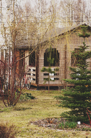 early spring garden view in march or April. Rustic wooden house on background