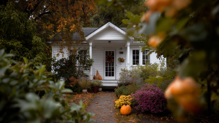 A quaint cottage decorated for Halloween stands surrounded by colorful autumn leaves and flowers.