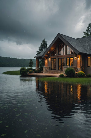A cozy lakeside house stands beautifully against a backdrop of a dark, cloudy sky and reflecting on the water, creating a moody and peaceful atmosphere. Perfect for real estate and travel marketing.