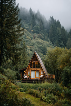 A cozy wooden cabin stands surrounded by dense greenery and towering trees in the mountains. Early morning fog adds a mystical touch to this tranquil retreat.