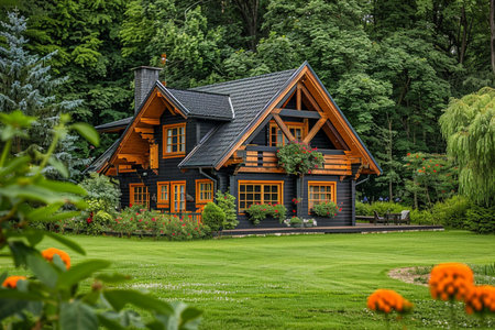 A charming wooden cabin nestled in vibrant foliage and colorful flowers, offering a serene retreat. The inviting structure and lush garden create a harmonious escape into nature, perfect for relaxation and rejuvenation.