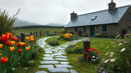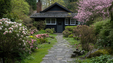 A picturesque garden pathway leads to a cozy cottage surrounded by vibrant spring flowers, creating a tranquil and inviting outdoor space filled with natural beauty.