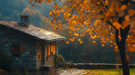 Traditional stone house located in the countryside, water drops falling from tree leaves, calm morning light generative ai