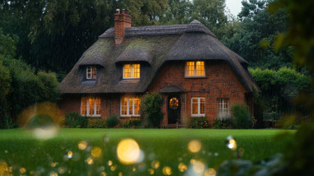 Picturesque farmhouse with a thatched roof, surrounded by lush greenery, sparkling water drops in the air, soft lighting, generative ai