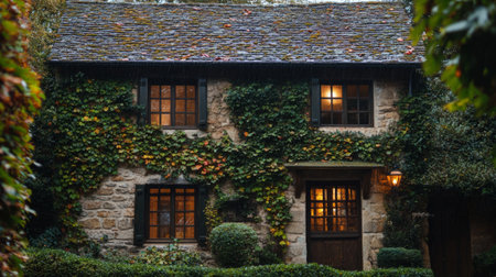 Charming stone country house with ivy-covered walls, raindrops on the window, cozy atmosphere, generative ai