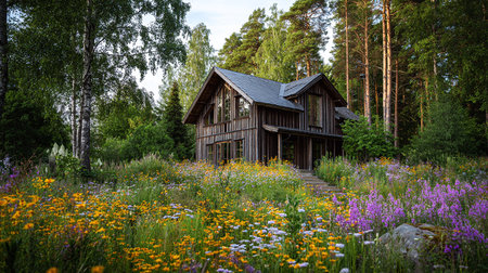Wooden house in the forest with wildflowers in the foreground