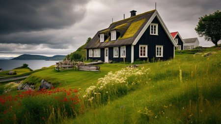 An AI generated illustration of a house on a green cliff on a cloudy day