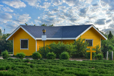Luxury wooden house in the garden. Beautiful architecture in the summer.