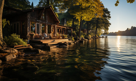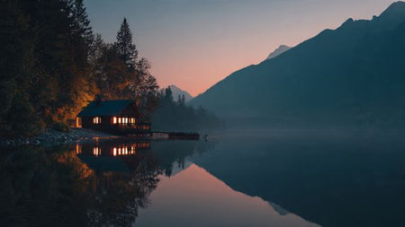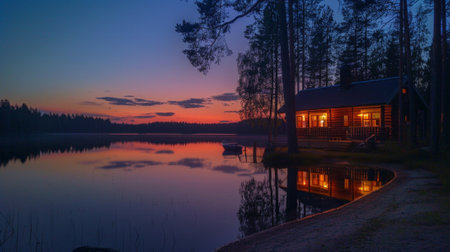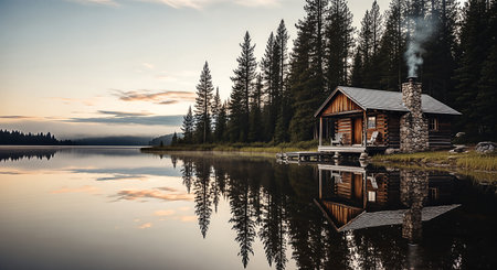 AI Generated. Tranquil Lake Cabin Reflected in Peaceful Water at Dusk