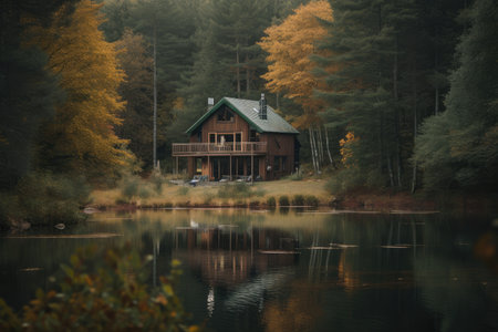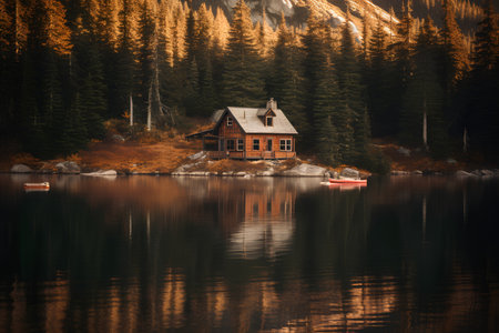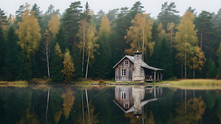 Wooden cabin on a lake shore with forest in the background, autumn colors reflecting on water