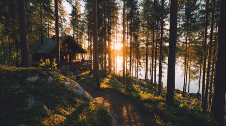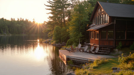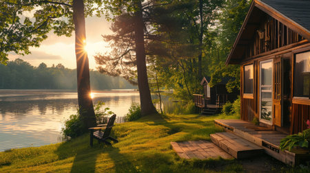 A beautiful lakeside cabin bathed in warm sunset light, surrounded by vibrant green trees, creating a tranquil outdoor escape for relaxation and reflection.