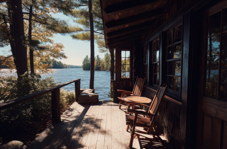 An inviting cabin porch overlooks a serene lake. The composition features wooden chairs and a table bathed in soft sunlight. Colors include browns, greens, and blues, creating a relaxing atmosphere. The image suggests a peaceful setting suitable for leisure or vacation themes and could be useful for various commercial applications.