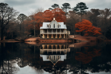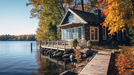 Peaceful cottage by the lake in autumn season