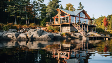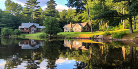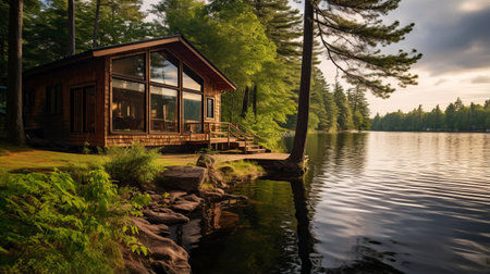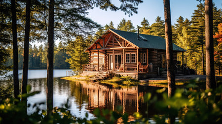 cozy cabin surrounded by forest and water in a serene forest, created with generative ai