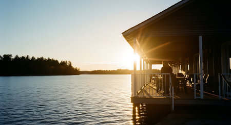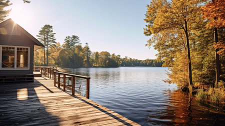 A wooden deck extends toward a calm lake, with a house and trees providing a scenic backdrop. The scene is bathed in sunlight, with a natural composition of textures and colors. The image suggests potential use in travel, design, or lifestyle projects, suitable for a wide range of creative applications.