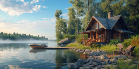 Charming log cabin getaway by a peaceful lake surrounded by vibrant forest and clear skies