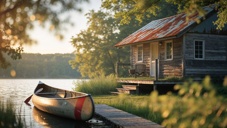 Quiet lakeside cabin with a canoe at sunset surrounded by lush greenery