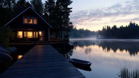 A cozy cottage sits by a tranquil lake at twilight, with soft light spilling from the windows. Mist rises from the water, creating a peaceful atmosphere surrounded by trees.