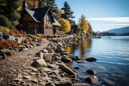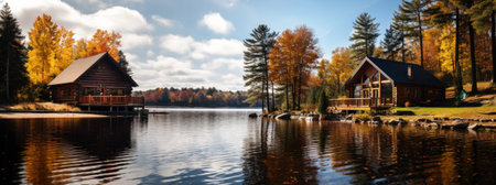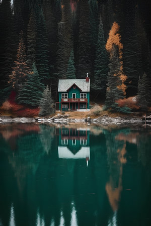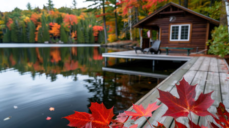 A picturesque lakeside scene featuring a cozy cabin surrounded by vibrant autumn foliage. Colorful leaves reflect in the calm water, evoking tranquility.