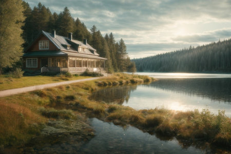 This picturesque image shows a beautiful wooden country house nestled among the trees on the banks of a tranquil river. The warm rays of the setting sun illuminate the scene, creating a peaceful and serene atmosphere. Realistic illustration created by Generative AI