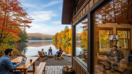 Friends gather by a lake enjoying the autumn season. The scene features people near a cabin with large windows showing interior views. The composition includes vibrant fall foliage and a calm lake, bathed in natural light. This visual is suitable for various commercial uses, illustrating leisure and connection.