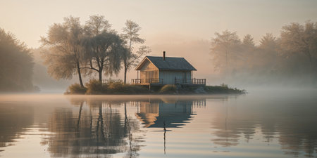 3D rendering of a wooden house on a lake in the morning