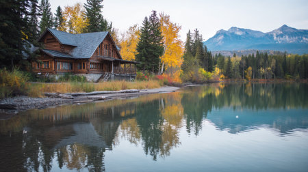 This stunning image captures a rustic lakeside cabin in autumn splendor, reflecting on calm waters, surrounded by vibrant foliage and majestic mountains.
