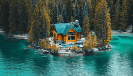 A small log cabin sits on the shore of a lake, AI