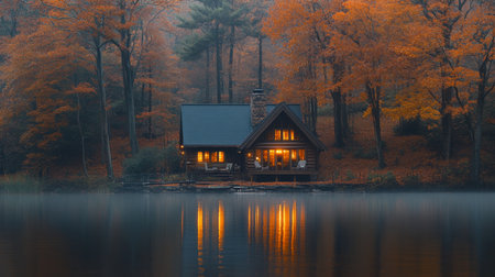 A tranquil autumn scene featuring a cozy lakeside cabin surrounded by vibrant orange foliage. the calm water reflects the colorful trees and picturesque landscape, creating a serene sunset atmosphere. ideal for seasonal and landscape themes. Generative AI