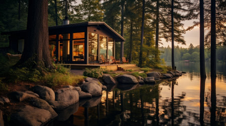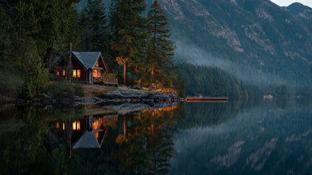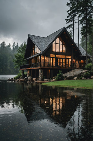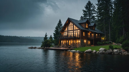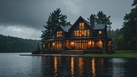 A cozy wooden lake house illuminated by lights sits nestled by calm water under a stormy sky. The scene evokes a sense of peace and serenity Ideal for real estate and travel publications.