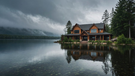 A lake house sits peacefully on the water's edge, reflecting in the still water beneath a dramatic cloudy sky, creating a moody atmosphere; perfect for travel blogs or vacation homes.