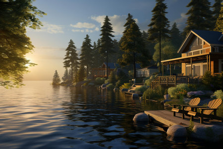 3D render of a lake in the forest with houses at sunset