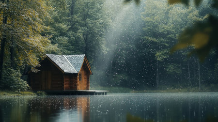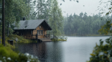 A cozy wooden cabin sits on a lake during a rainy day, with misty water and dark forest backdrop Perfect for illustrating travel destinations or moody landscapes.
