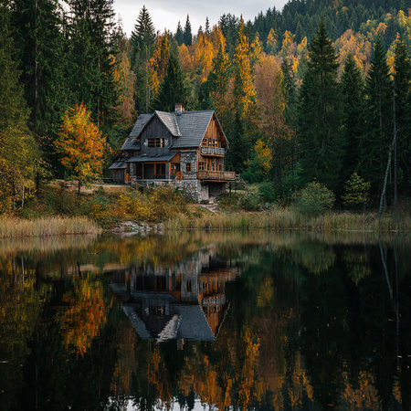A cozy wooden cabin nestled in vibrant autumn foliage reflects beautifully in a calm pond. This serene landscape captures the essence of fall in nature.