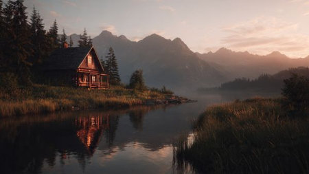 A picturesque lakeside scene featuring a rustic cabin nestled among trees, mirrored in the calm waters at sunrise, evoking a sense of peace and serenity.