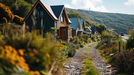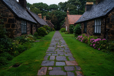 Stroll along a picturesque garden pathway lined with colorful flowers and charming cottages, bathed in warm sunlight under a clear blue sky. Perfect for relaxation.