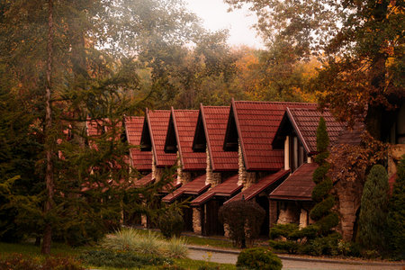 Europe village rural cottage alley landscaped exterior decorated space country side land woods environment space September autumn aesthetic with dramatic lighting