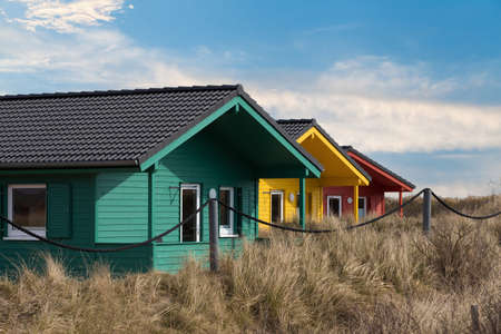 Helgoland city - colorful wooden tiny houses on the island Dune near island Helgoland against blue sky