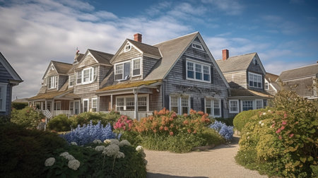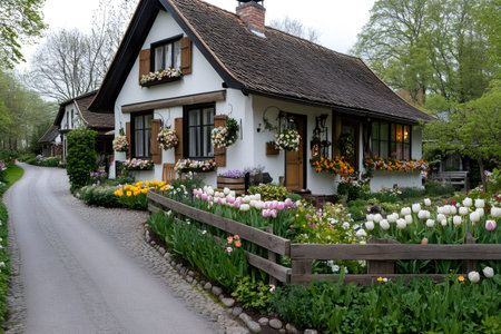 Beautiful house with a well-kept garden full of colorful flowers, creating a picturesque and idyllic scene