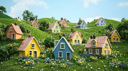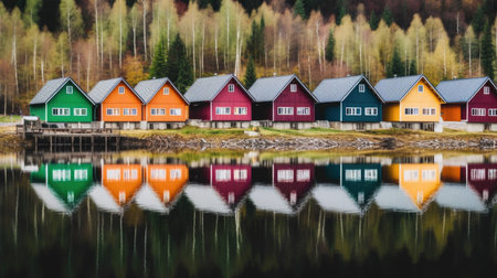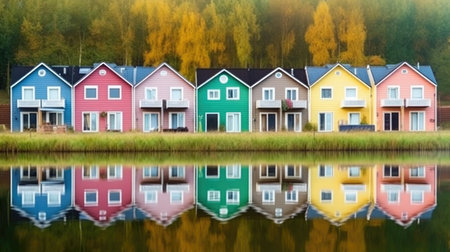 Discover a vibrant scene of colorful houses surrounded by lush greenery, showcasing unique architectural styles and cheerful colors in a serene setting.
