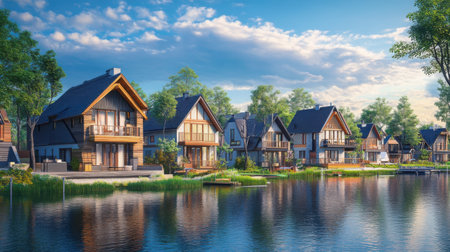 A variety of small residential homes along a peaceful lakeside street, each with a unique exterior